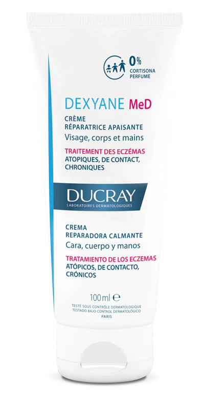 Dexyane MeD crema reparadora calmante trata, favorece la desaparición de las lesiones de eczema y limita su reaparición. La piel queda protegida gracias a su textura placentera que forma una película semioclusiva en la superficie.